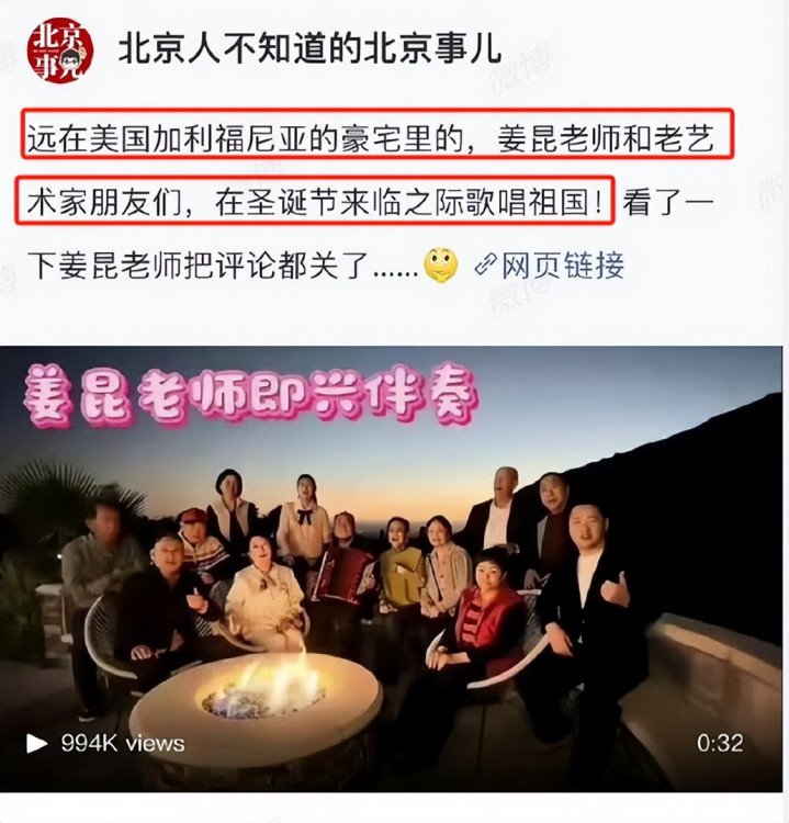 一段视频在网上流传,画面里姜昆和友人聚在豪宅,众人围坐在一起,合唱红歌《我和我的祖国》。