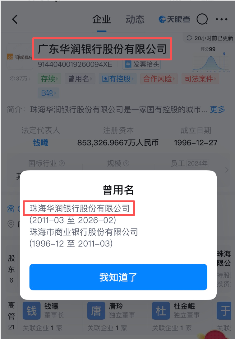 天眼查显示,华润银行的最新全称为广东华润银行股份有限公司,珠海华润银行股份有限公司已经成为曾用名。今年2月11日,广东金融监管局批复珠海华润银行变更名称。而名称变更后,华润银行的品牌势能和业务版图预计将有更多扩张。